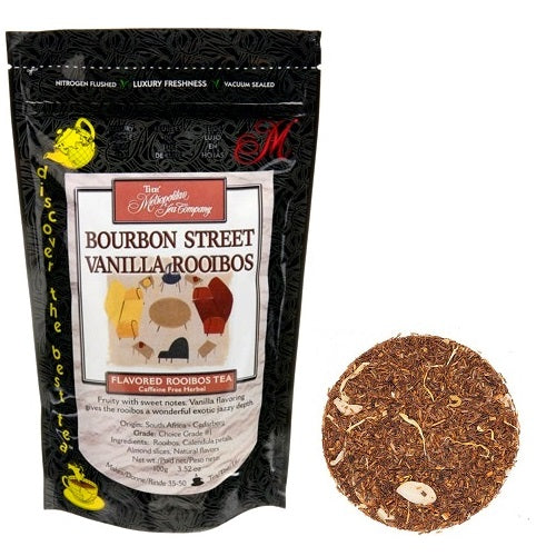 Bourbon Street Vanilla Rooibos Tea is fruity with sweet notes. Vanilla flavoring gives the rooibos a wonderful jazzy depth.